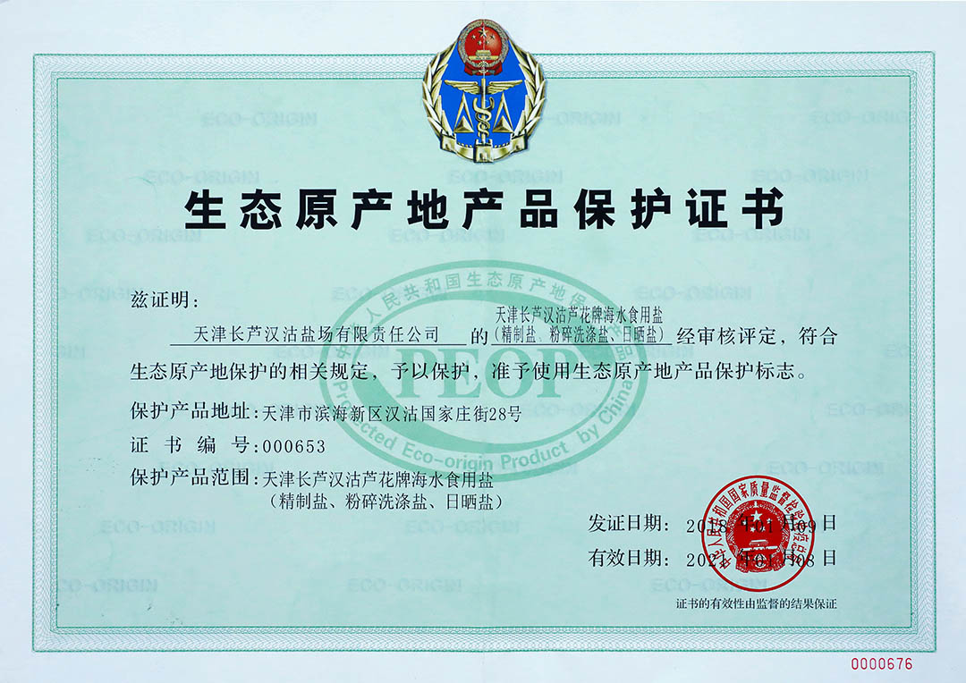 2018年1月---2021年1月,“蘆花”牌海水食用鹽成為國家生態(tài)原產(chǎn)地產(chǎn)品,獲得質(zhì)檢總局生態(tài)原產(chǎn)地產(chǎn)品保護(hù)認(rèn)證