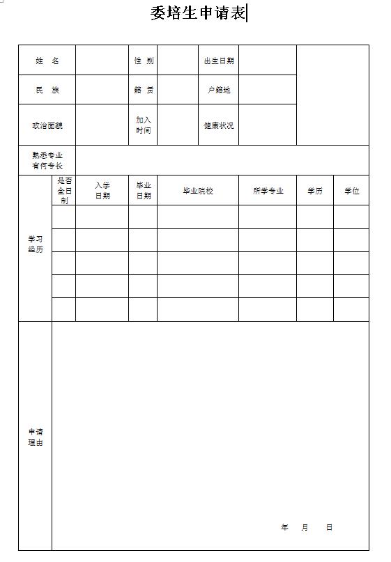 附:《委培生申請(qǐng)表》 下載: 《委培生申請(qǐng)表》 .docx