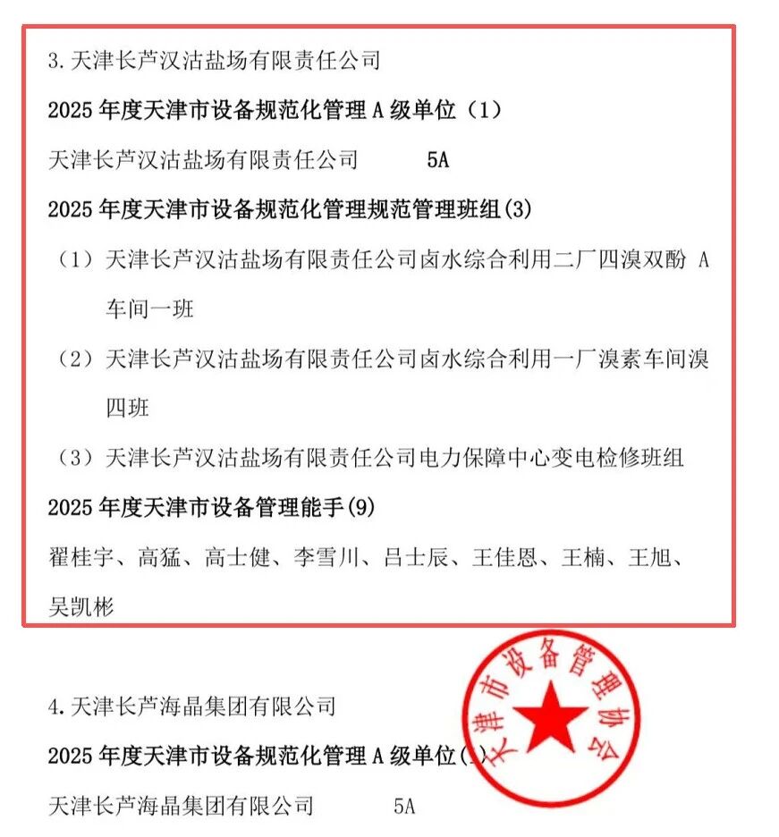 近日,天津市設(shè)備管理協(xié)會公布了2025年度天津市設(shè)備規(guī)范化管理等級評定結(jié)果,漢沽鹽場憑借健全的管理體系、卓越的運(yùn)行成效與深厚的技術(shù)積淀,榮獲“2025年度天津市設(shè)備規(guī)范化管理5A級單位”;鹵水綜合利用二廠四溴雙酚A車間一班、鹵水綜合利用一廠溴素車間溴四班、電力保障中心變電檢修班榮獲“2025年度天津市設(shè)備規(guī)范化管理班組”;翟桂宇、高猛、高土健、李雪川、呂士辰、王佳恩、王楠、王旭、吳凱彬9名職工榮獲“2025年度天津市設(shè)備管理能手”稱號。